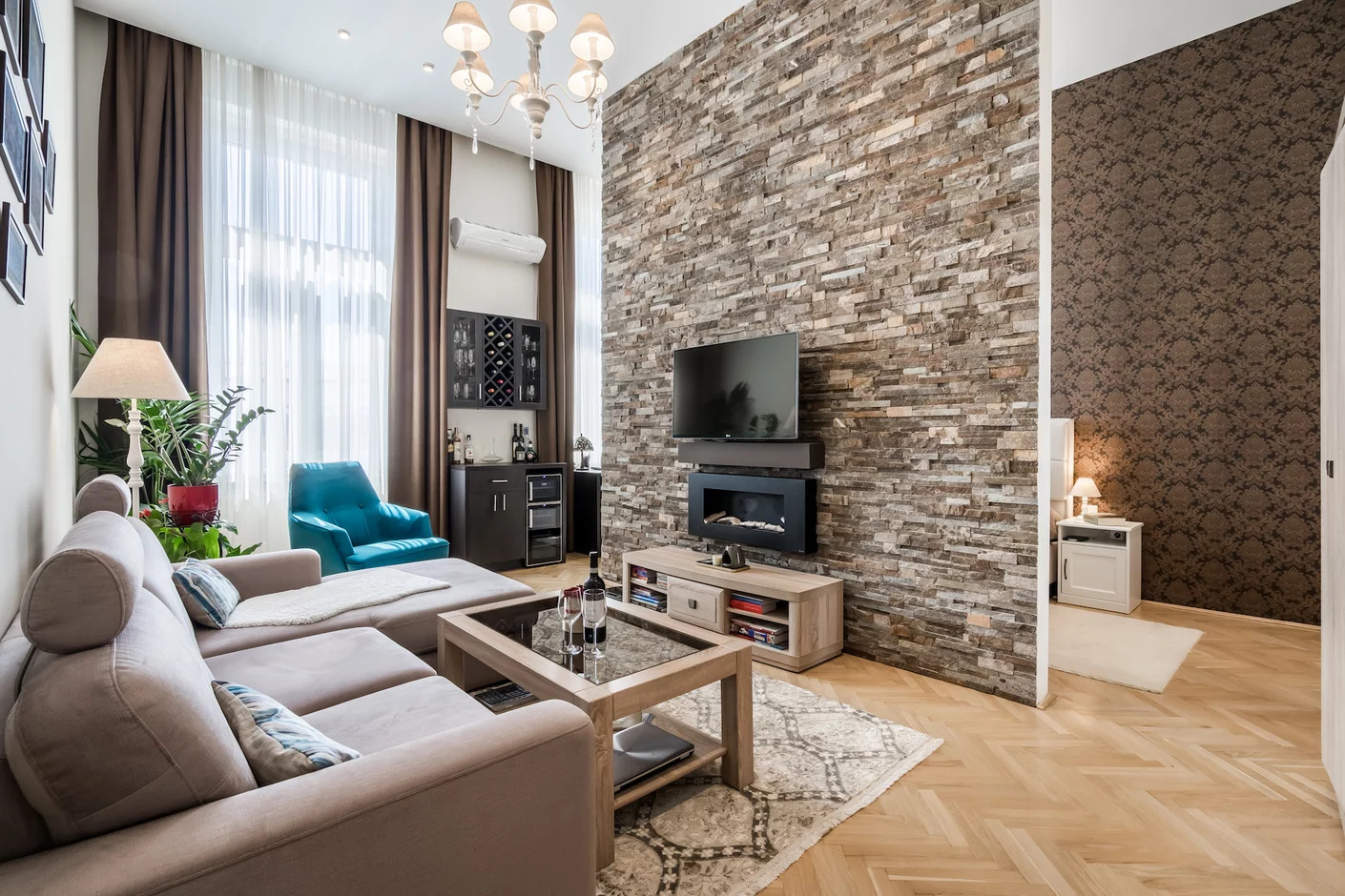 Ezt a belvárosi, 57 m2-es műemlék védelem alatt álló lakást egy kedves fiatal doktornővel kezdtük el felújítani, több ütemben, majd a felújítás végén már a vőlegényével költözött vissza a XIII. kerületi otthonba. A lakás eredeti elrendezése nem volt ideális, hiszen egyik kisebb szobából nyílt egy nagyobb, így se a nappali, se a hálószoba nem volt megfelelően kialakítva. A tulajdonos először még galériában gondolkodott, de erről sikerült lebeszélnem, és egy jobb alternatívát mutatnom: egy vékony fallal válasszuk le a háló terét a nappaliból, ahol két oldalról megközelíthető az ágy, de nem vesztünk sok helyet a nappaliból sem. Ezt a falat statikussal kellett megterveztetni, hiszen a teherbírását gerendával kellett biztosítani a betervezett kőburkolat súlya miatt.
